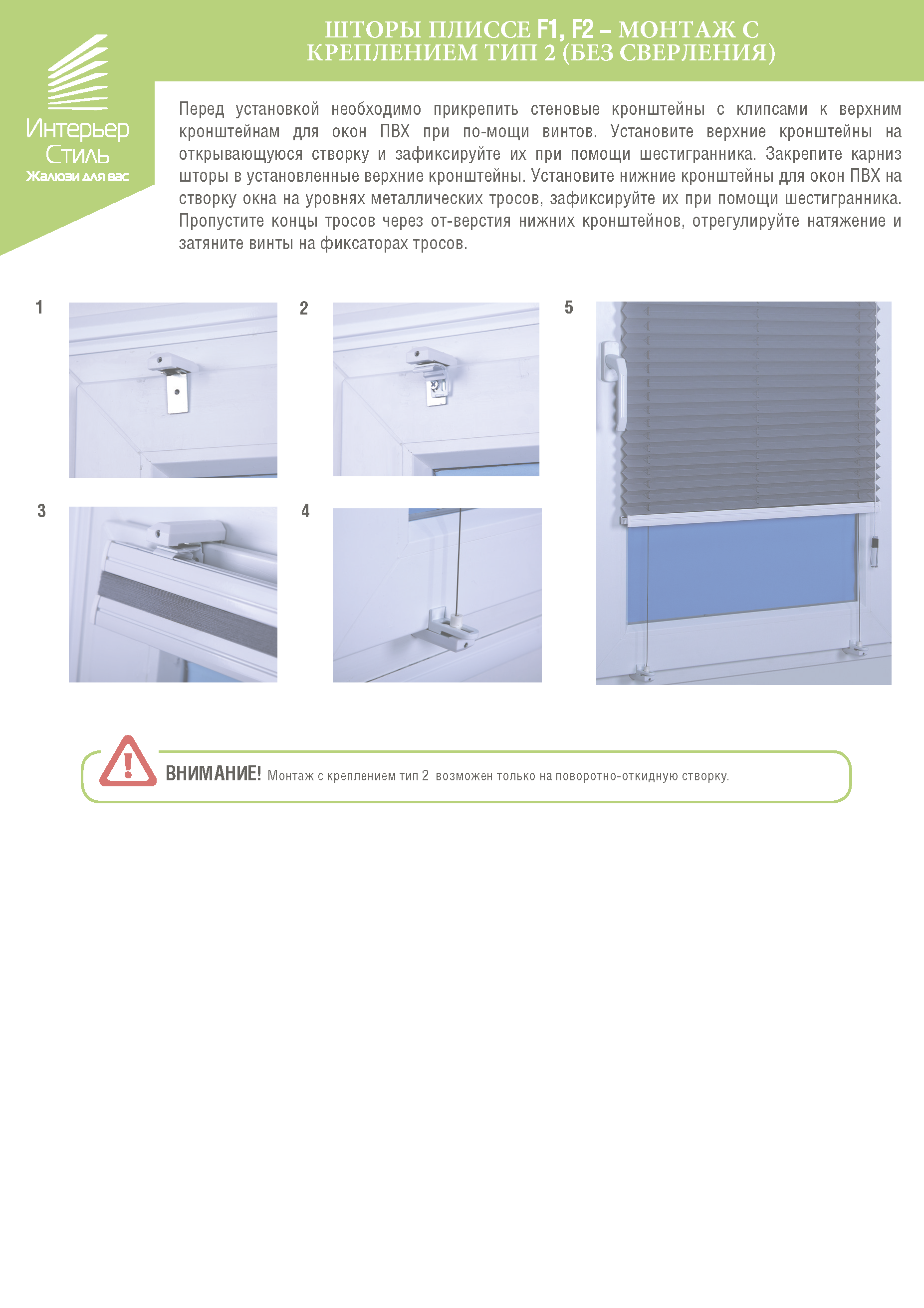 Шторы плиссе F1, F2 - монтаж с креплением тип 2 (без сверления)